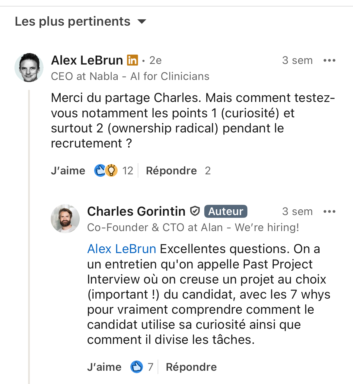 Ce type de questions est par exemple utilisé par Alan dans le Past Project Interview, un entretien qui consiste à revenir en détail sur un projet antérieur réalisé par le candidat, afin d’explorer ses comportements et ses modes de fonctionnement.